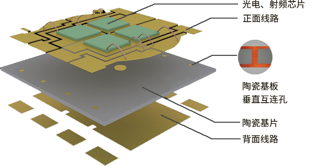 薄膜電路陶瓷封裝基板是一種通過磁控濺射薄膜金屬化與電鍍制程的技術(shù):即根據(jù)應(yīng)用需要,在高導(dǎo)熱的陶瓷基體上,采用薄膜金屬化及影像轉(zhuǎn)移方式制作2D金屬線路,然后采用TCV(Through Ceramic Via) 技術(shù)形成雙面布線間的垂直互連,最后采用堆疊技術(shù)獲得與陶瓷基體結(jié)合緊密的一體式3D金屬框架?;诒∧る娐饭に?,通過磁控濺射實(shí)現(xiàn)陶瓷表面金屬化,通過電鍍實(shí)現(xiàn)銅層和金成的厚度大于10微米以上即DPC(DirectPlateCopper-直接鍍銅基板)。